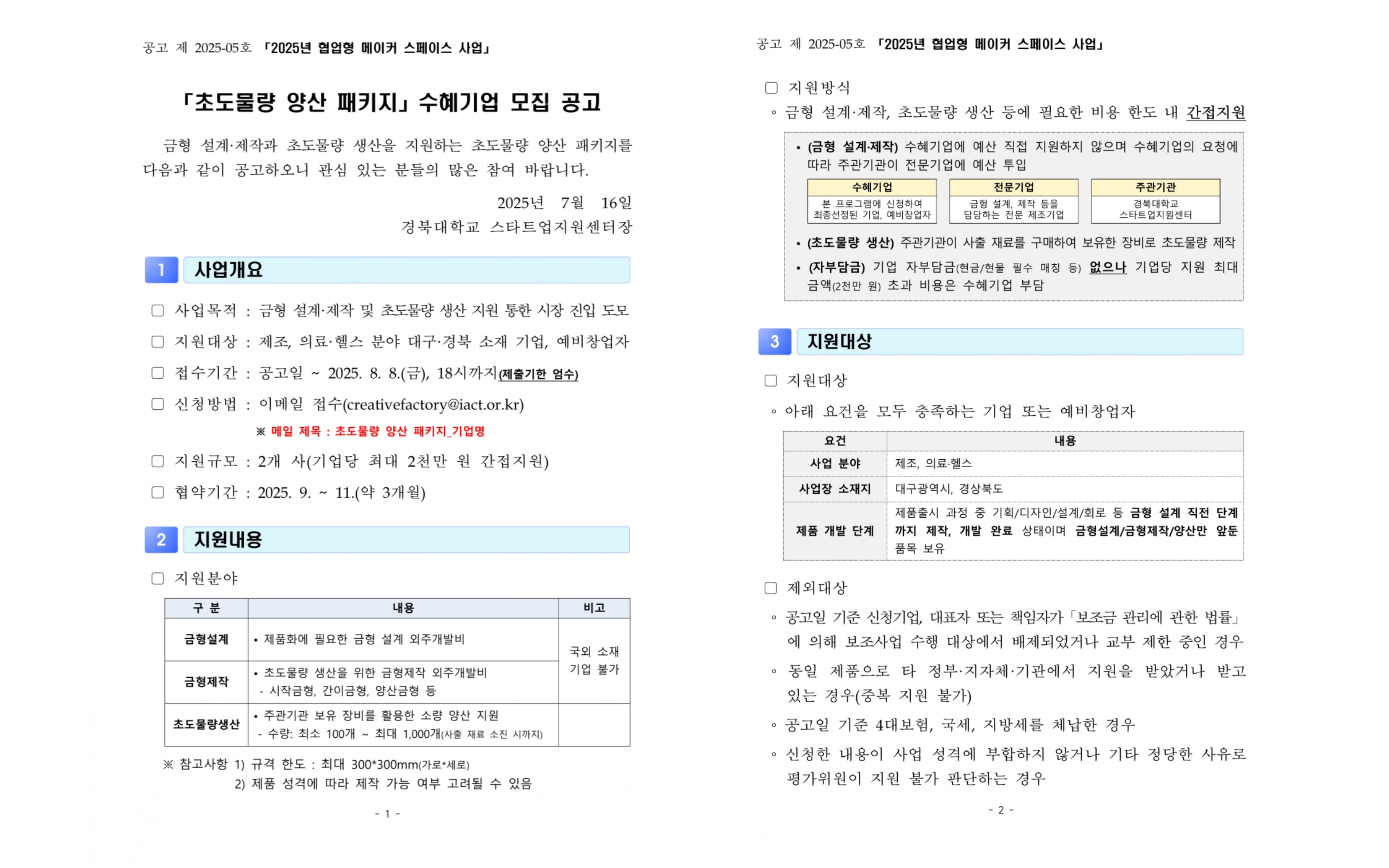 | 지원내용 | 금형 설계, 초도물량 생산 간접 지원 (최대 2천만 원) |