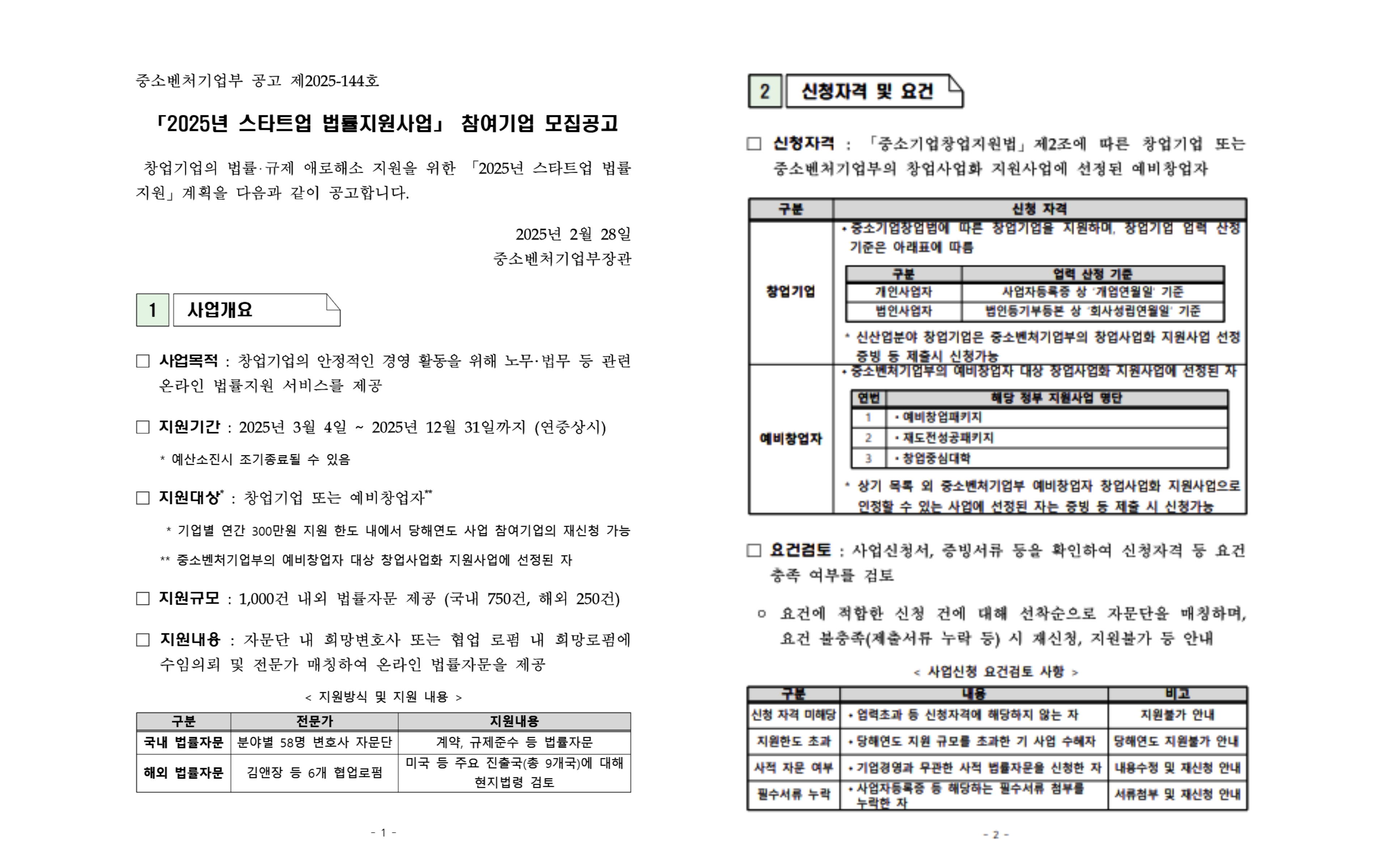 중소벤처기업부, ‘2025년 스타트업 법률지원’ 참여기업 모집