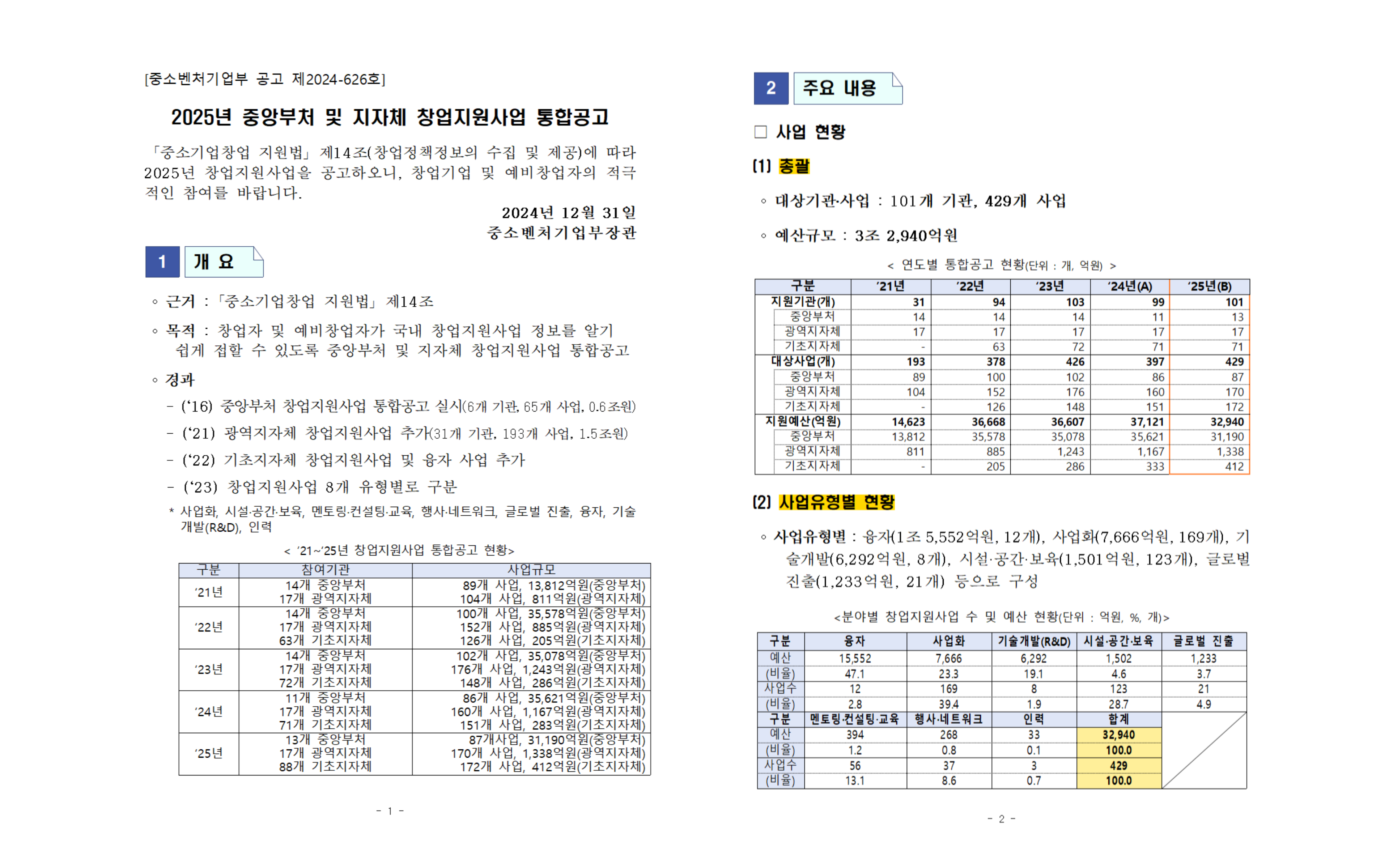 중소벤처기업부에서 2025년 한 해 동안 시행되는 중앙부처 및 지방자치단체의 창업지원사업을 통합해서 공고했습니다. 2024년 12월 31일부터 2025년 12월 31일까지 신청을 받으며, 예비창업자 및 창업기업 모두 해당됩니다. 각 사업마다 개별 공고문이 있으므로, 지원하고자 하는 사업의 일정과 자격 조건을 반드시 확인한 뒤 신청해야 합니다. 연중 다양한 창업·지원 기회를 한눈에 찾아볼 수 있게 되었습니다.