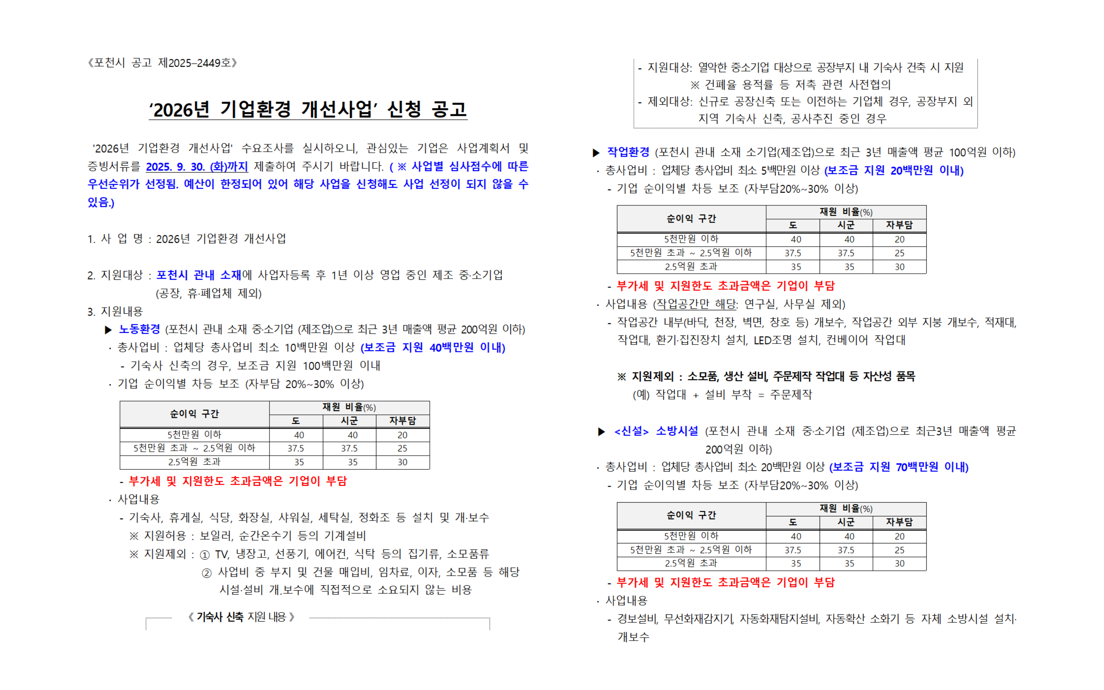 | 모집대상 | 포천시 내 1년 이상 영업 중인 제조 중소기업 (공장, 휴‧폐업체 제외) |