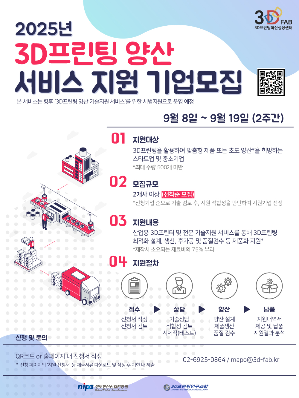 대상은 시제품 제작을 완료하고 제품화 단계에 있는 기업이며, 신청은 2025년 9월 8일부터 19일까지 3D-FAB 홈페이지에서 온라인으로 가능합니다.