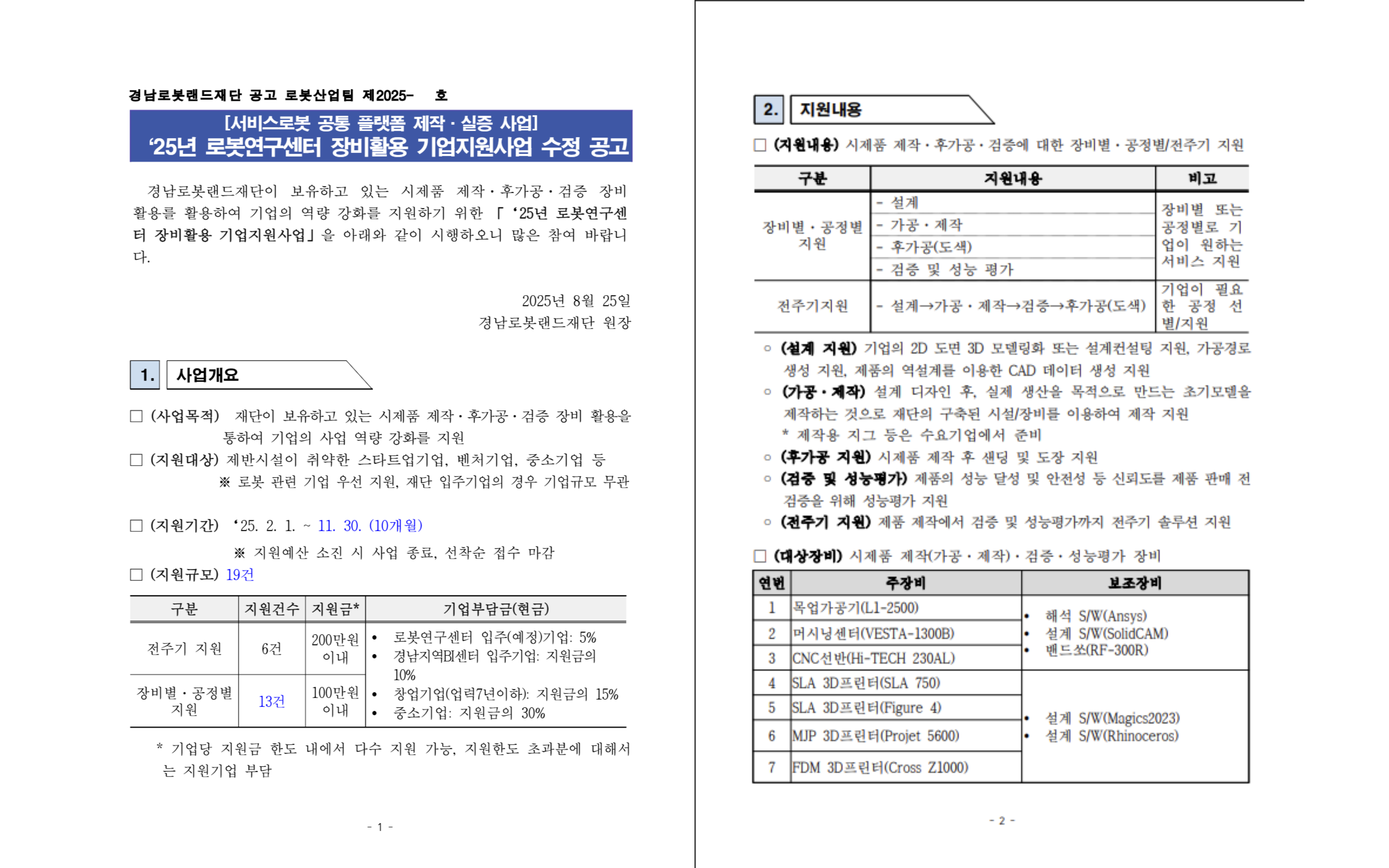 ‘2025년 로봇연구센터 장비활용 기업지원사업’은 시제품 제작부터 성능 검증까지 실제 장비 사용을 지원하며, 최대 200만원까지 비용을 지원합니다.