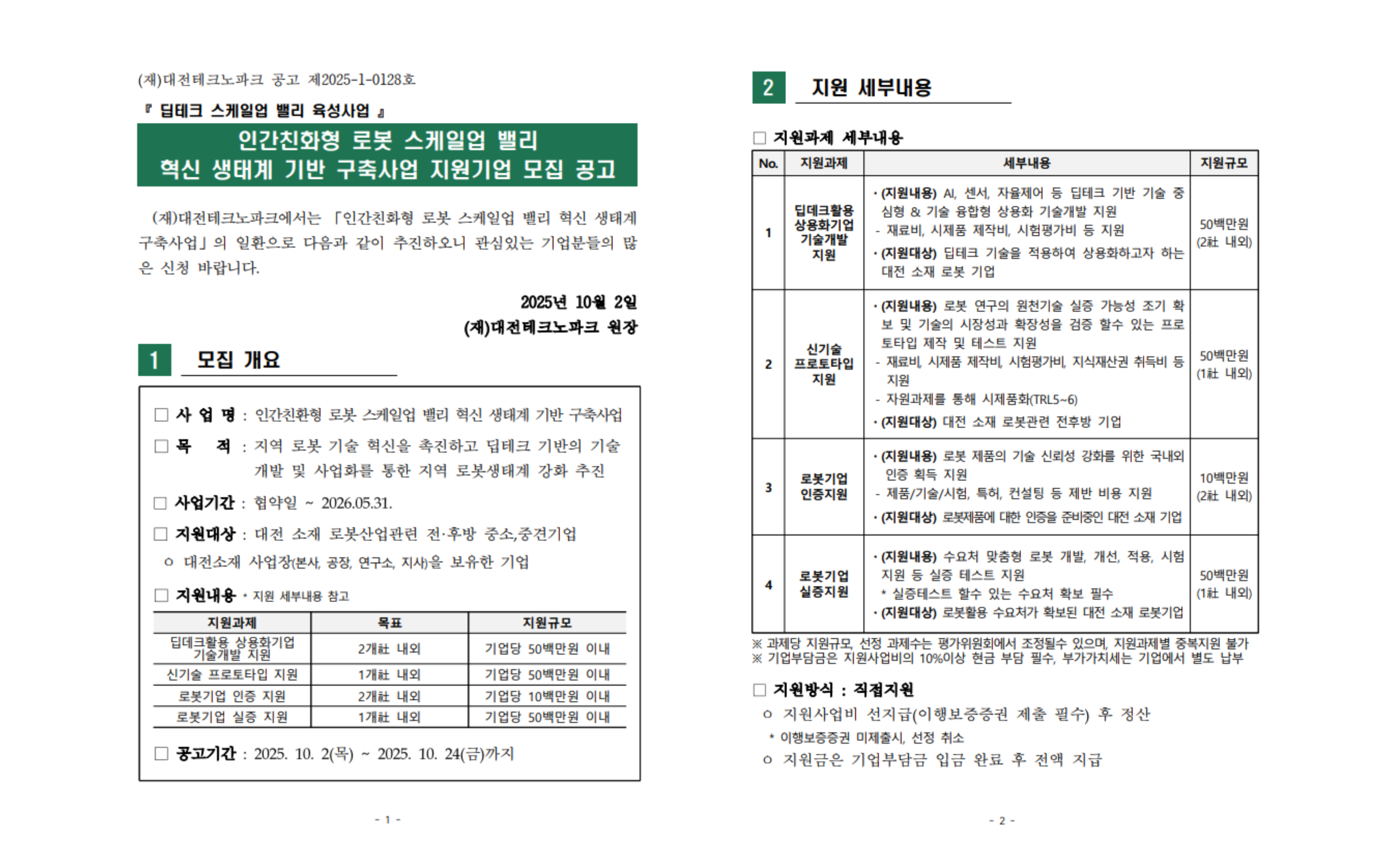 | 모집대상 | 대전 소재 로봇산업 관련 중소·중견기업 (본사, 공장, 연구소, 지사 중 1개 이상 보유) |