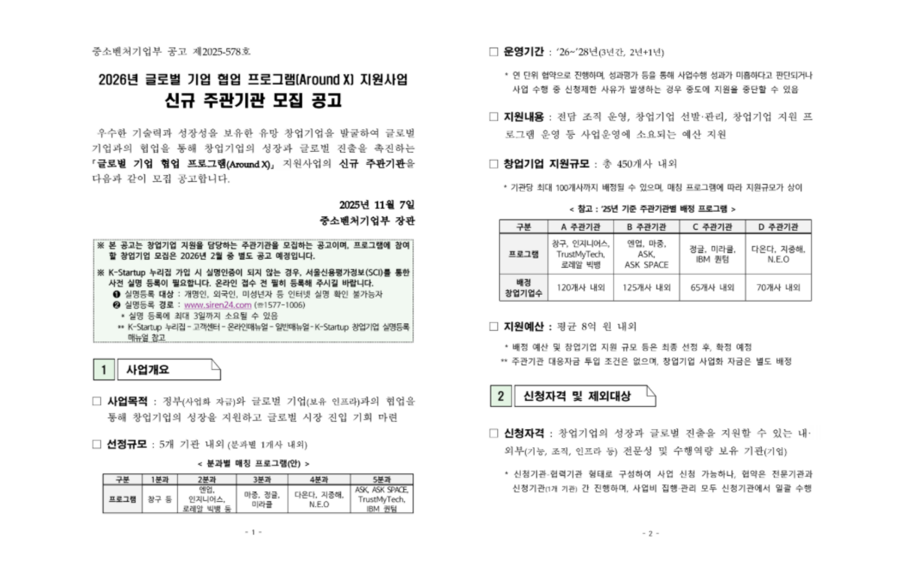 창업진흥원에서 2026년 ‘글로벌 기업 협업 프로그램(Around X)’을 운영할 신규 주관기관을 모집합니다. AI, 바이오, 우주항공 등 글로벌 기업과 스타트업의 협업을 이끄는 역할을 하며, 선정 기관에는 평균 약 8억 원의 운영예산이 지원됩니다. 전국 단위 모집이며, 접수는 K-Startup에서 11월 27일까지 진행됩니다.