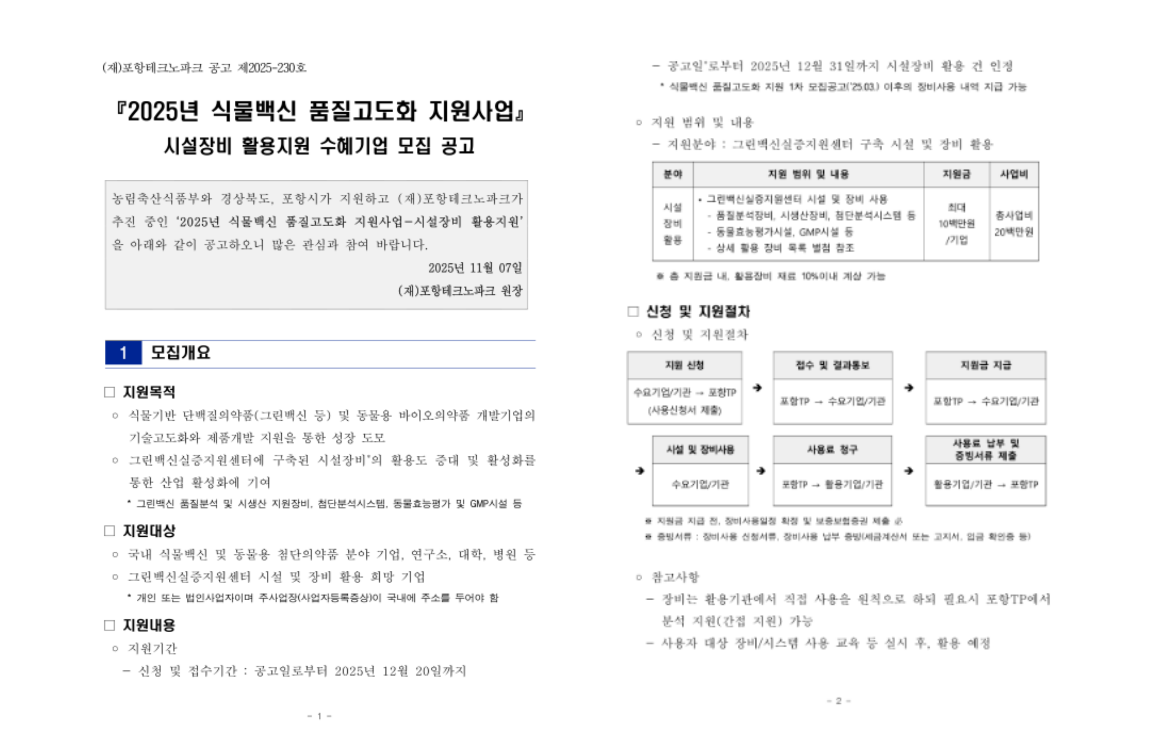 포항테크노파크에서 식물백신 및 동물용 바이오의약품 기업을 대상으로 시설장비 활용비 최대 1,000만 원을 지원하는 사업을 운영합니다. 그린백신실증지원센터 내 장비를 활용할 수 있으며, 국내에 본사를 둔 법인 또는 개인사업자가 신청 가능합니다. 접수는 12월 20일까지 이메일로 진행되며, 예산 소진 시 조기 마감될 수 있습니다.