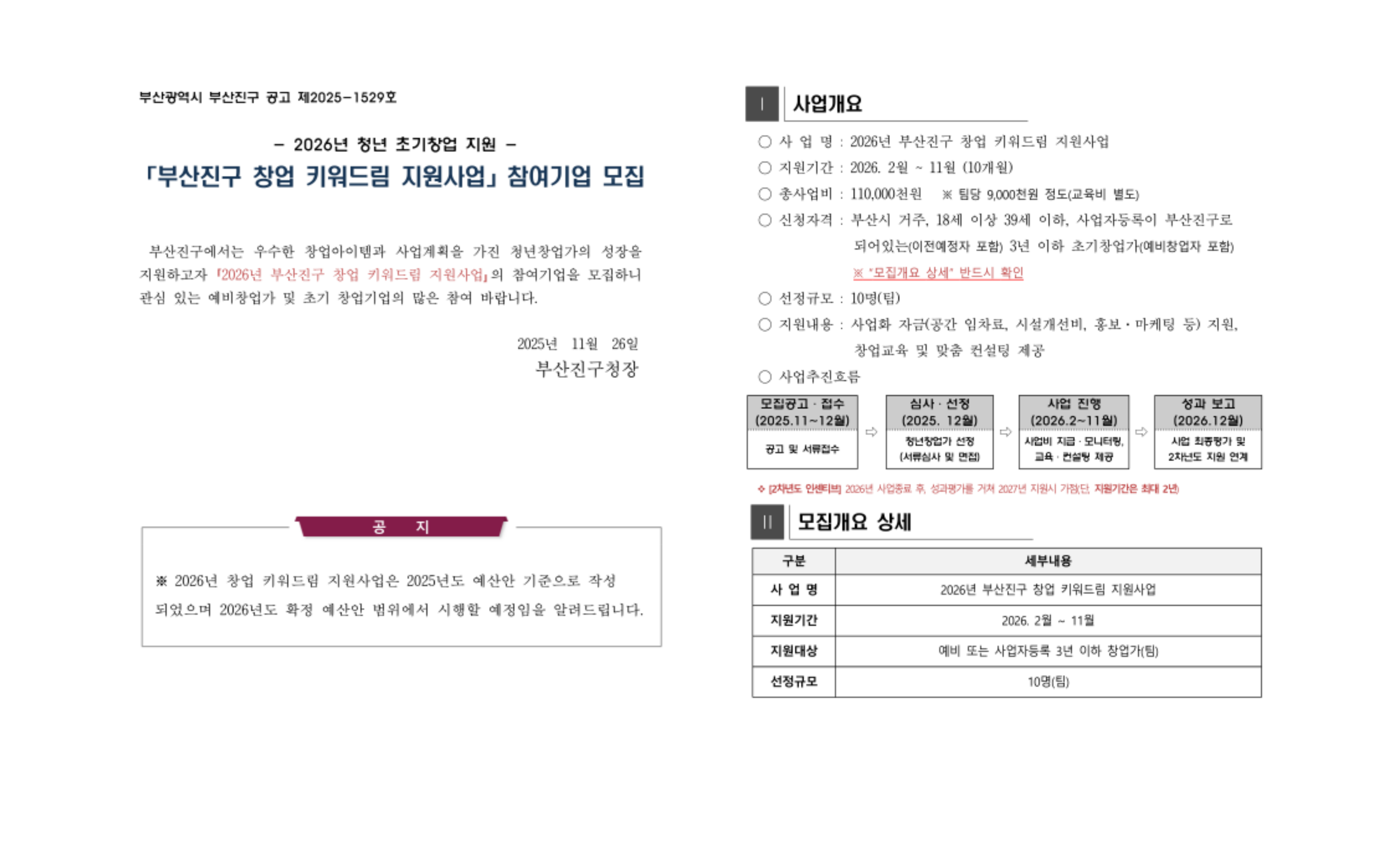 [부산] 진구 2026년 청년 초기창업 지원 창업 키워드림 지원사업 참여기업 모집 공고 (~12/09)