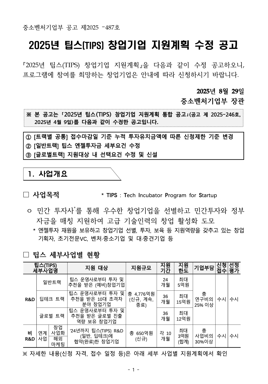 [전국] 2025년 팁스TIPS 창업기업 지원계획 수정 공고(~12/31)